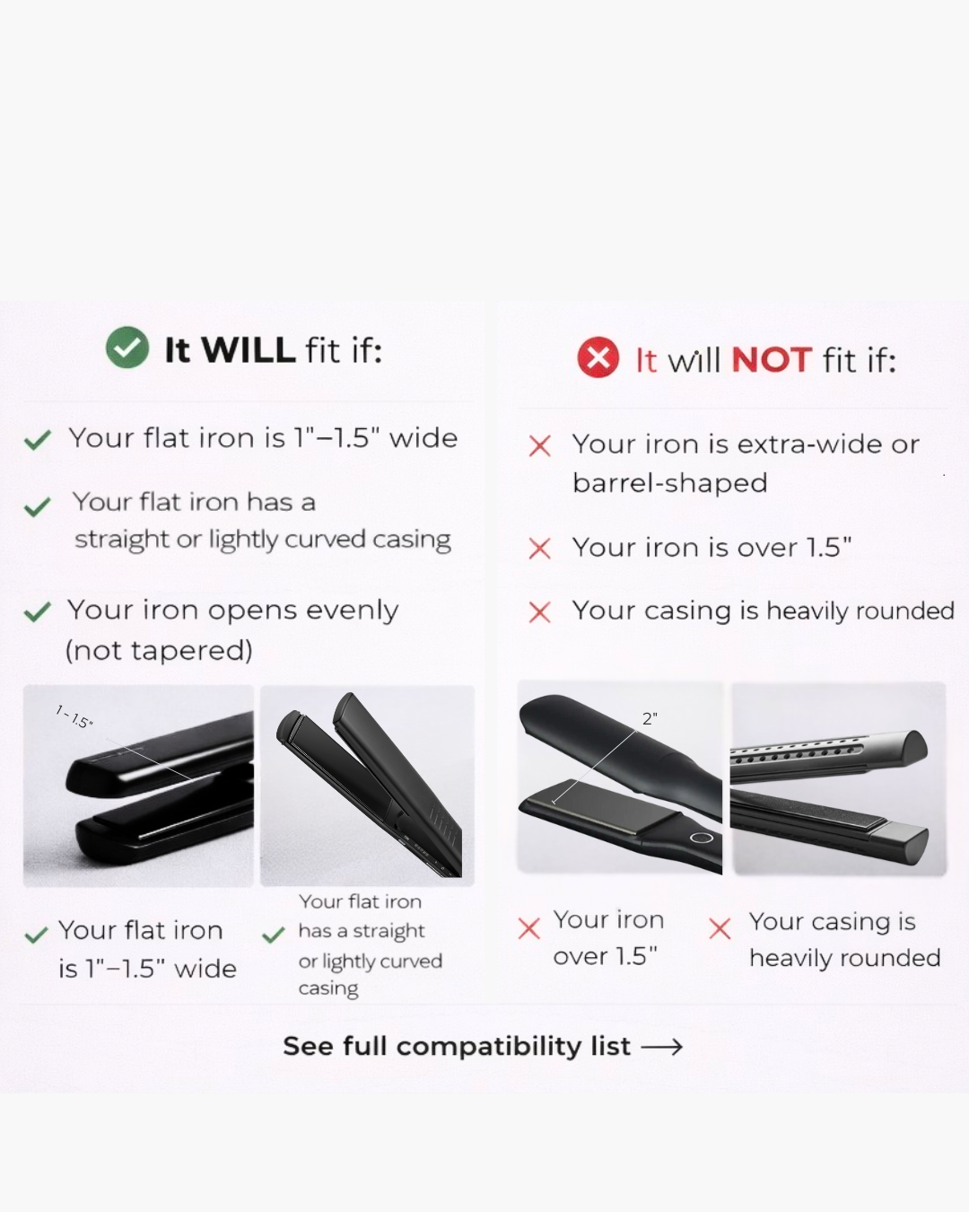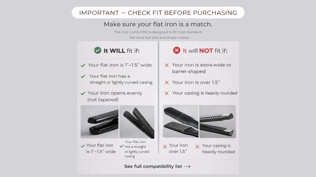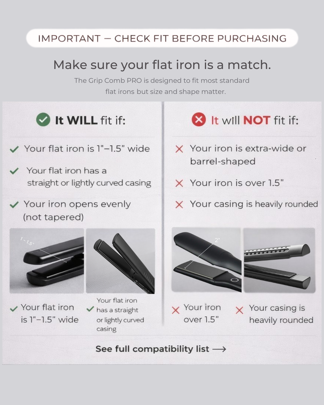 The Grip Comb PRO fits most standard flat irons, but size and casing shape matter.