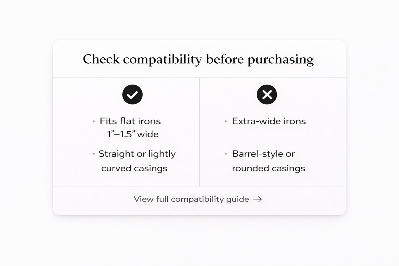 The Grip Comb PRO is designed to fit all standard flat-top straighteners and slightly curved-edge straighteners sized 1 inch to 1.5 inches wide. Its screw-on design ensures a snug, secure fit—no slipping, no adhesives, and no damage to your tool. If your flat iron falls within that size range, you're good to go.